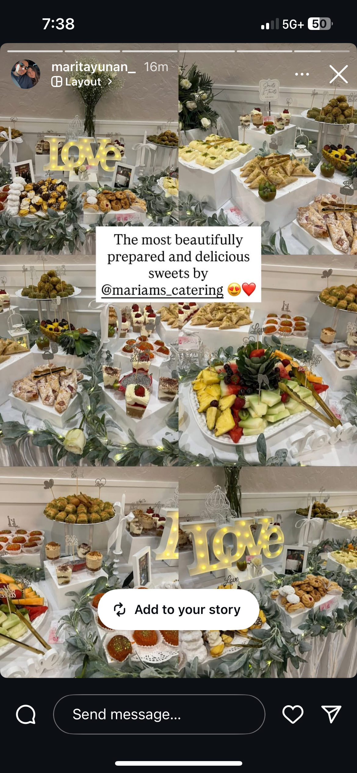 "Mariam did an amazing job catering the bride's house for my wedding. The food was fresh and delicious and the setup was aesthetically pleasing. Best of luck.